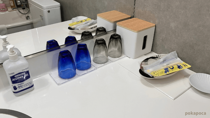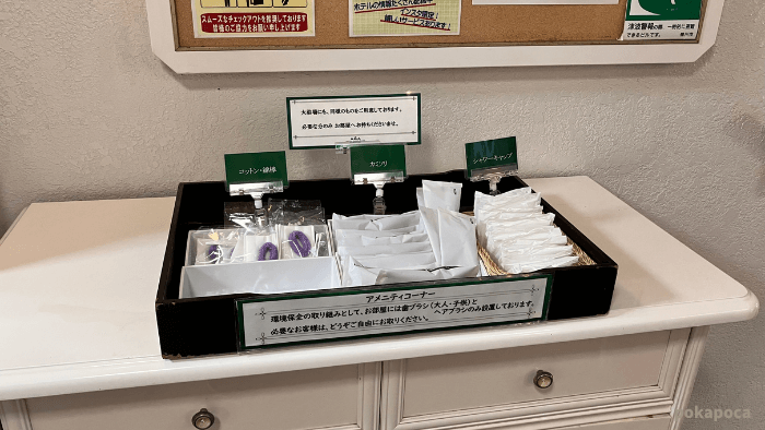 廊下にアメニティコーナーもあるので、足りないときはそこから取っていけます。