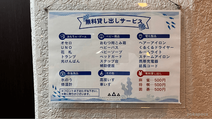 無料貸し出しサービスがあって、どの部屋でもおもちゃやベビー用品、家電製品、救急用品やいすなどが借りれます。